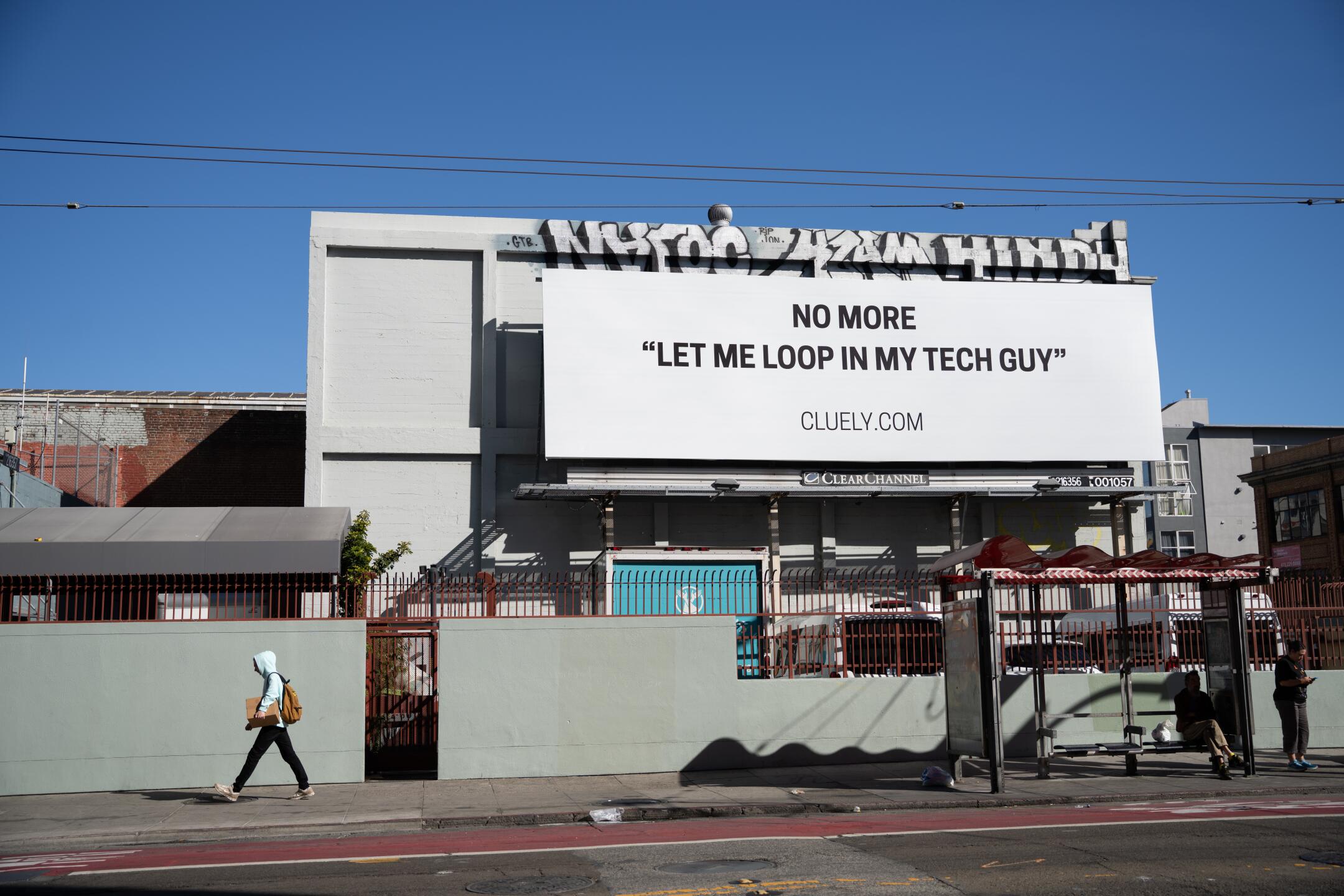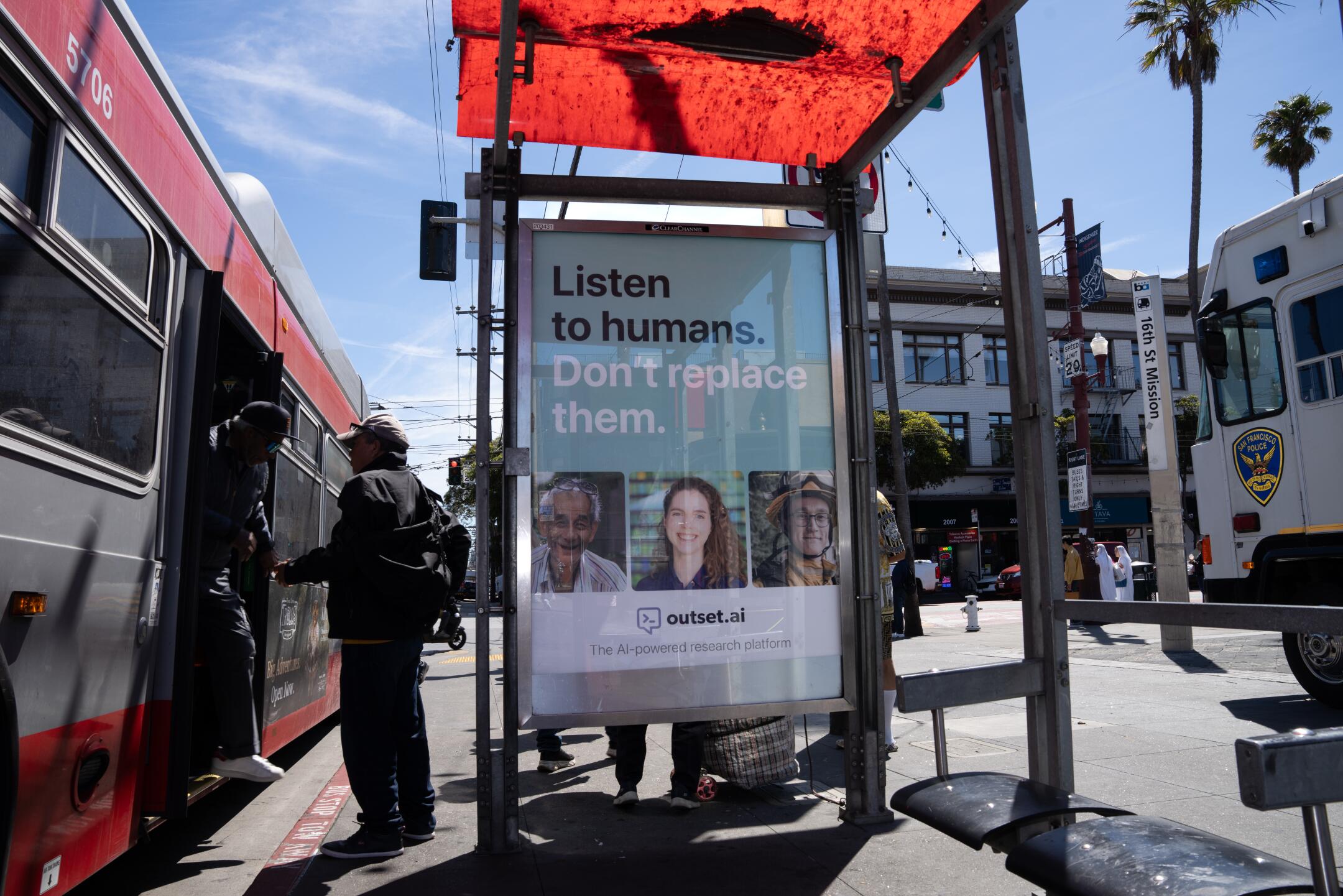 At a bus stop on 16th Street, an ad from AI startup Outset struck a positive tone: “Listen to humans. Don’t replace them.”