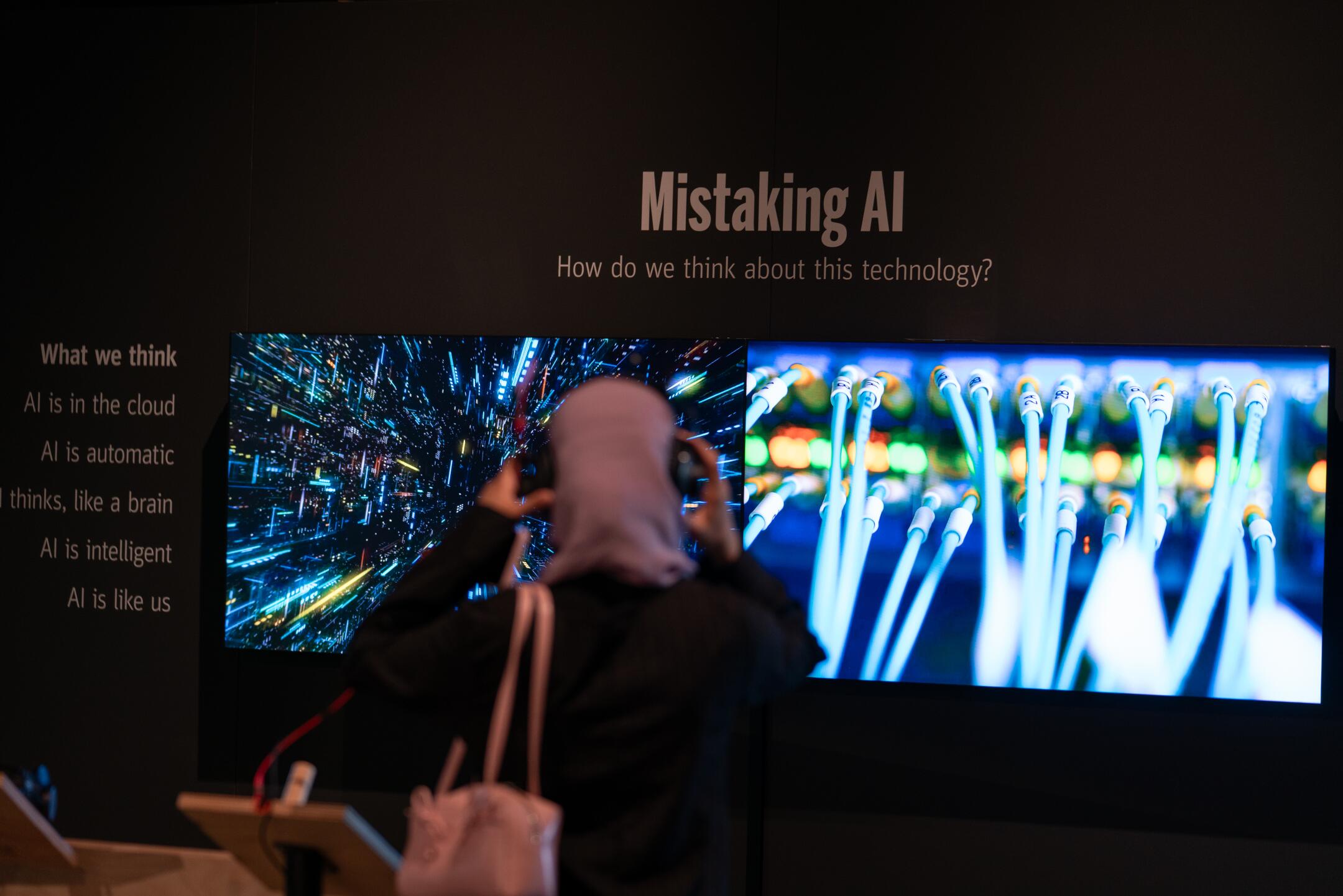 A visitor listens to the audio component of the “Mistaking AI” exhibit at the Exploratorium’s “Adventures in AI” in downtown San Francisco on Thursday.