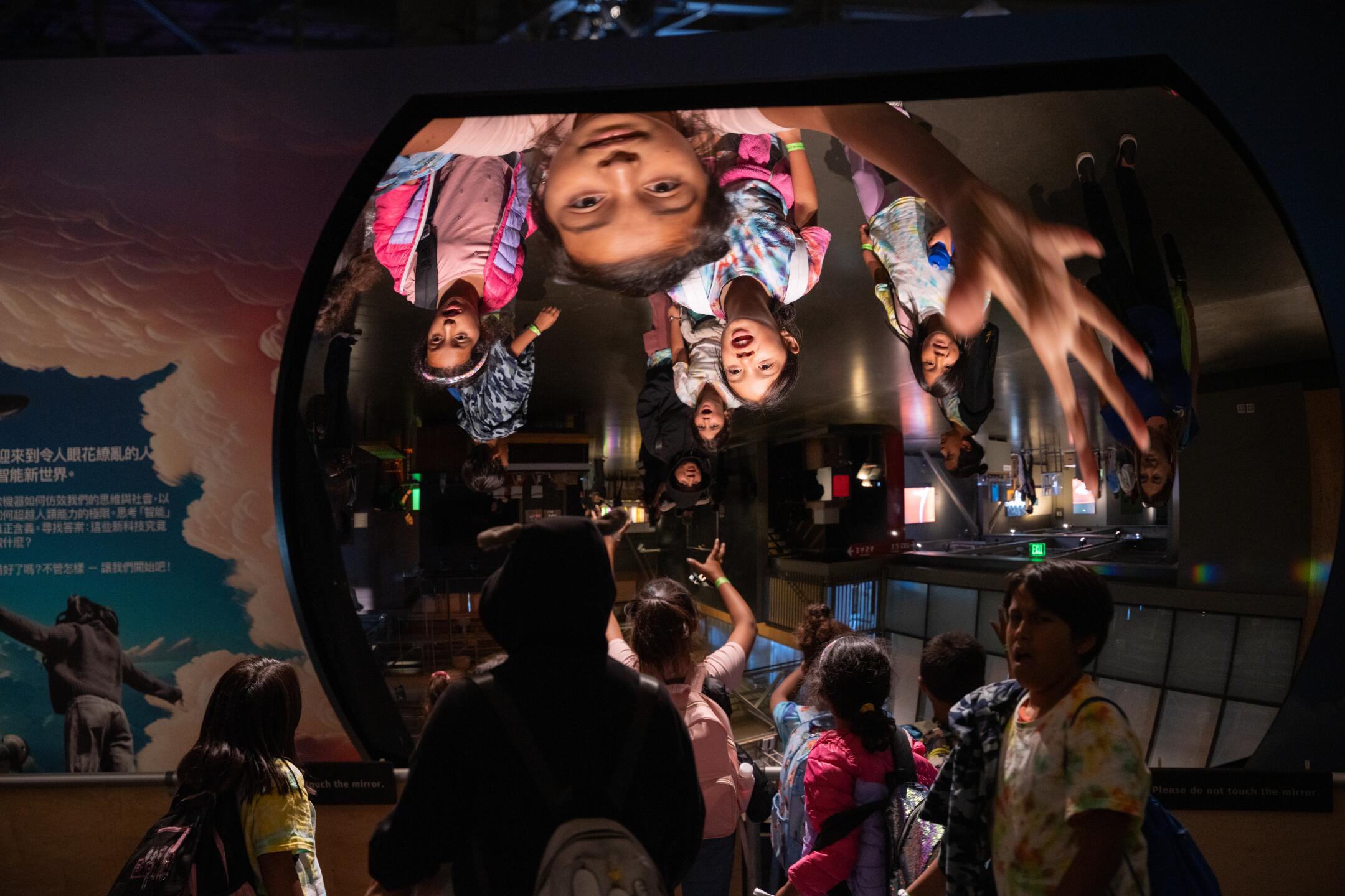 Children interact with the “Giant Mirror” at the Exploratorium’s “Adventures in AI” exhibition in Downtown San Francisco on Thursday.