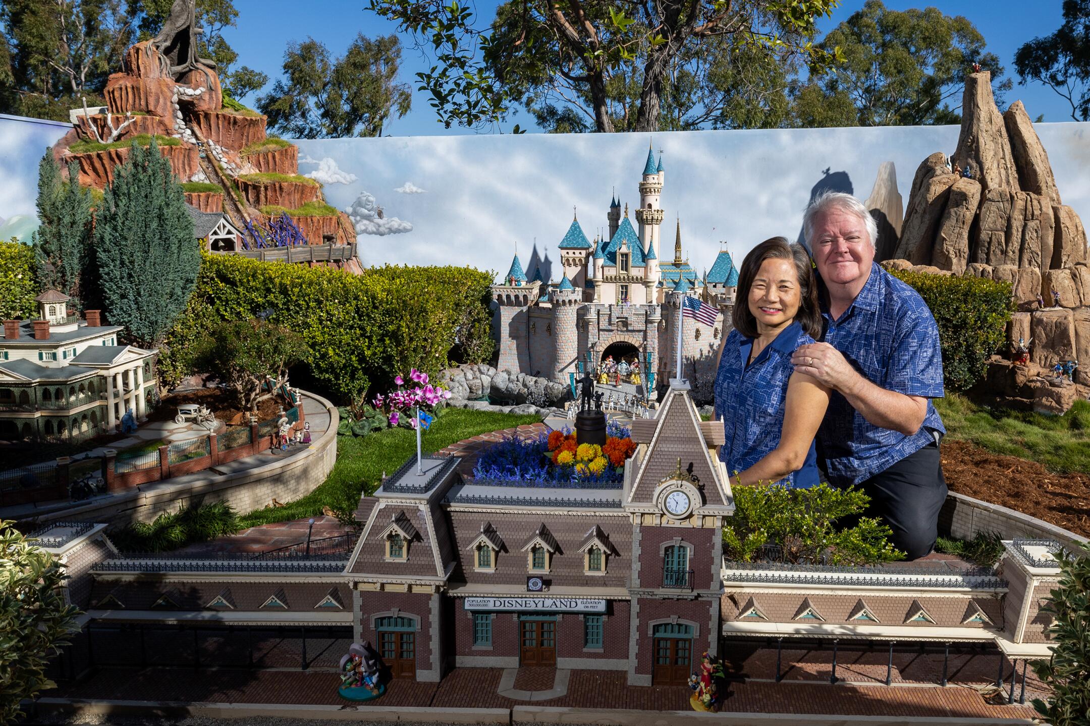 David and Frances Sheegog pose with their mini-Disneyland of their Anaheim Hills house.